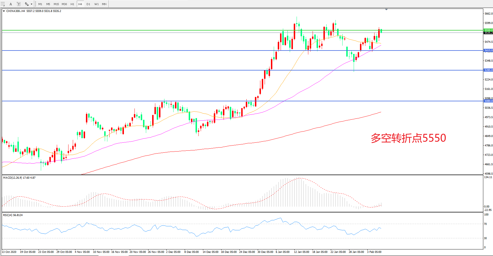 4小时图看,沪深300以55周期均线为依托震荡上行,短期走势有所回暖,5415成为下方支撑,5550成为多空分水岭,MACD红柱增加,RSI指标走平,日内延续震荡概率较大。