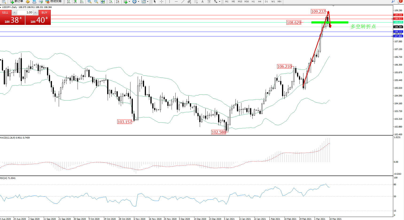 技术点评:多头动力延续布林带指标上轨附近节点持续震荡上扬,高位抵达109.237附近节点后遇阻急速反转回撤,空头动力有伺机入场态势,布林带指标呈张口走势持续中,下轨附近有反转向上移动迹象,MACD指标处于多头区域维持震荡不断上移中,RSI指标处于多头区域维持在80均衡线附近弱势整理后开始有反转下移迹象;