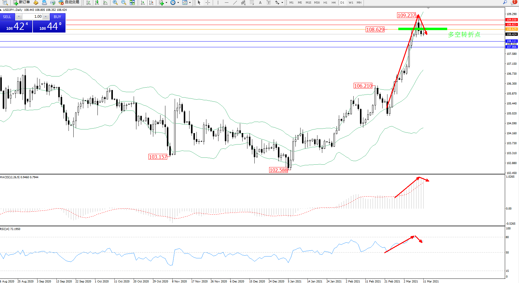 技术点评:多头动力延续布林带指标上轨附近节点持续震荡上扬,高位抵达109.237附近节点后遇阻急速反转回撤,空头动力有伺机入场态势,布林带指标呈张口走势持续中,下轨附近有反转向上移动迹象,MACD指标处于多头区域维持震荡不断上移中,RSI指标处于多头区域维持在80均衡线附近弱势整理后开始有反转下移迹象;
