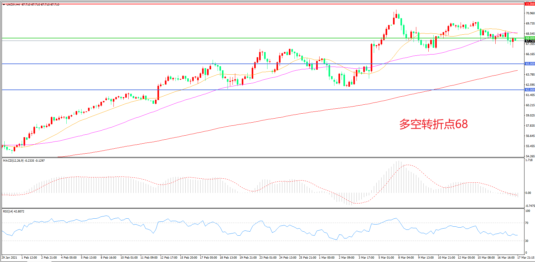 4小时图看,油价以55周期为依托延续高位震荡,整体波幅不大,68美元成为多空分水岭,70美元成为短期阻力,MACD绿柱增加,RSI指标走平,日内延续震荡概率较大。