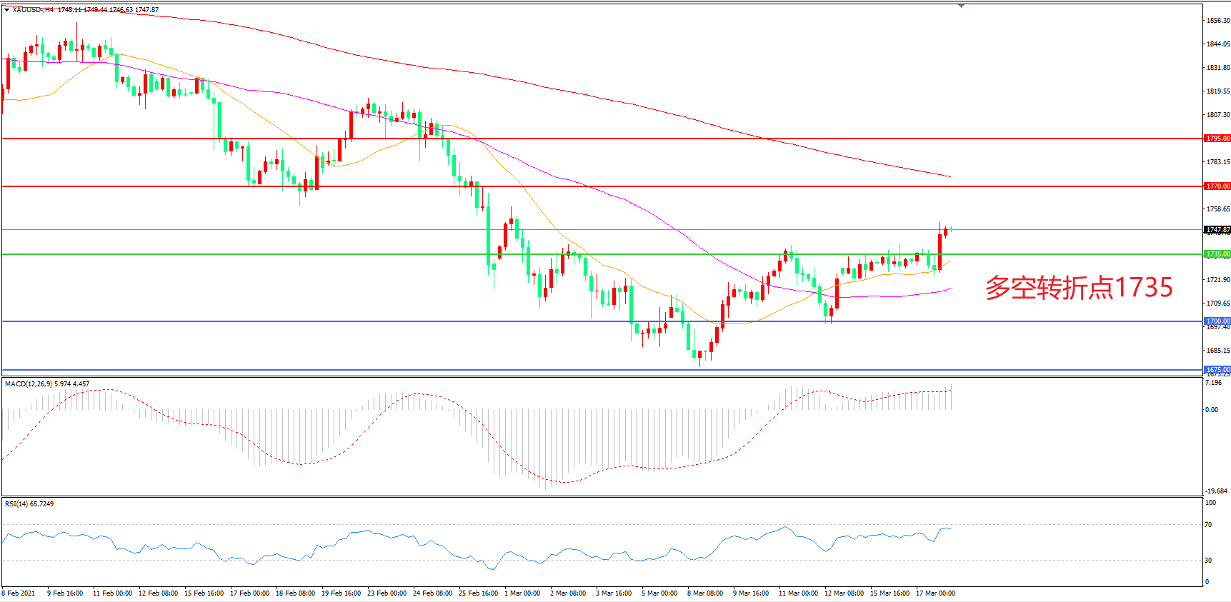 4小时图看,金价依托21周期均线整理后长阳拉升,短期走势出现回暖,1735被突破后,形态上有形成头肩底的可能,MACD红柱增加,RSI指标向上,日内震荡反弹概率较大。