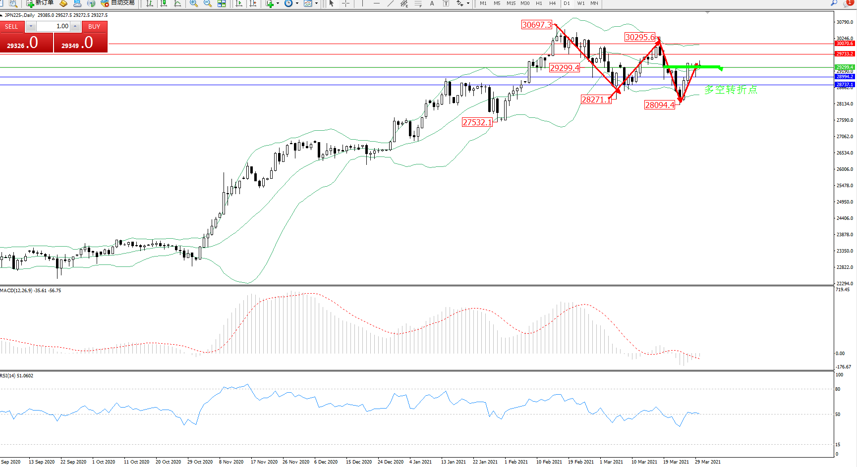 技术点评:高位空头动力维持在布林带指标通道宽幅震荡向下移动,低位抵达28094位置节点后得到支撑开始反转上移,突破中轨进入中上轨区间震荡,多头动力有急速反攻态势,关注中轨附近节点,MADC指标空头动力下行后长时间纠结于0轴线附近长时间维持震荡,RSI指标处于50均衡线附近弱势徘徊;