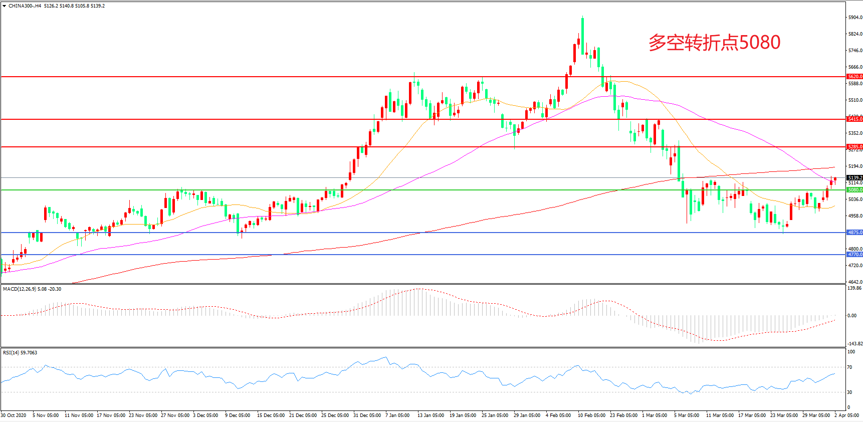 4小时图看,沪深300高开高走,短期走势有所企稳,5080成为多空分水岭,55周期均线形成下方支撑,MACD绿柱缩短,RSI指标向上,日内震荡上行概率较大。