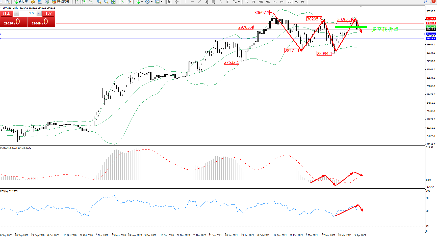 技术点评:长时间维持在布林带指标通道内宽幅震荡持续中,期间多次来回试探上下轨区间节点,多头动力上行至30263位置后遇阻回撤,即将触及布林带指标中轨附近节点,短期或有进一步向下移动迹象,MACD指标处于0轴线上方多头区域维持震荡后有回撤迹象,RSI指标处于50均衡线上方多头区域维持震荡后反转急速下行中;