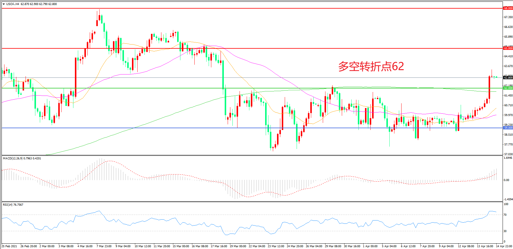 周三(4月14日),根据美国能源信息署公布的数据显示,当周EIA原油库减少589万桶,远高于市场预期,数据公布后,美国WTI原油大幅拉升,收报62.85美元/盎司。此前国际能源署发布一份报告,上调了原油需求预估。IEA表示,美国快于预期的新冠疫苗接种速度和新增确诊病例的大幅下降促进了“社交和人员流动,需求回暖的希望提振了人们对经济复苏的乐观情绪。