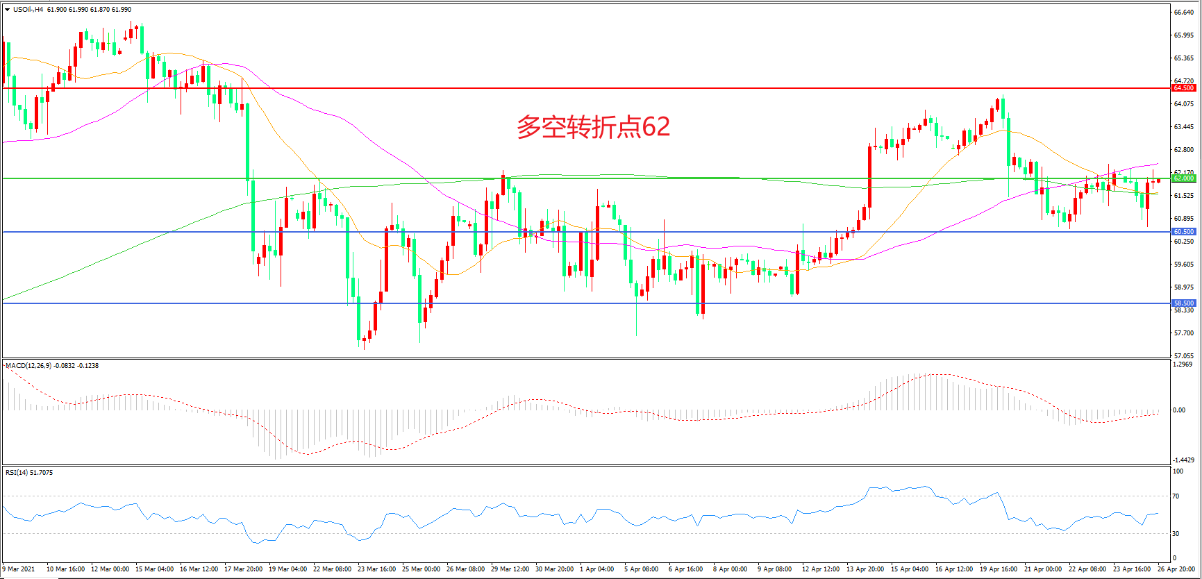 4小时图看,油价回踩60美元附近后小幅反弹,短期走势陷入震荡,62美元成为多空分水岭,均线系统逐步粘合,MACD绿柱缩短,RSI指标向上,日内延续震荡概率较大。