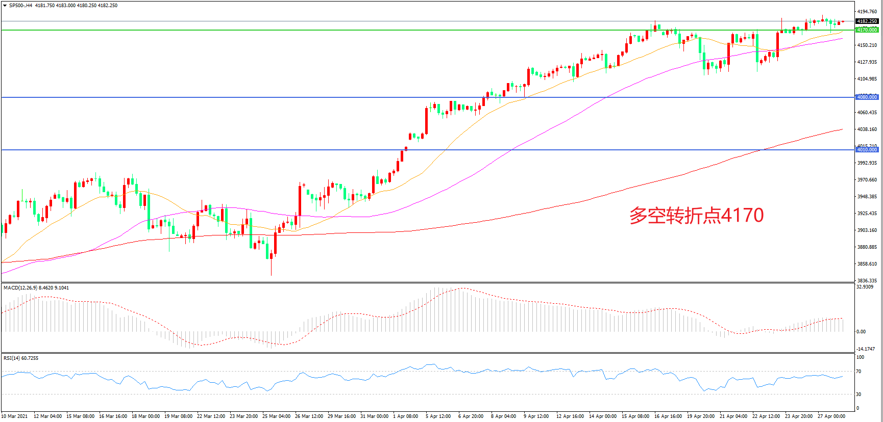 4小时图看,标普500跌突破4170后延续高位震荡,价格整体波幅不大,均线系统逐渐走高,MACD红柱增加,RSI指标走平,日内延续震荡概率较大。