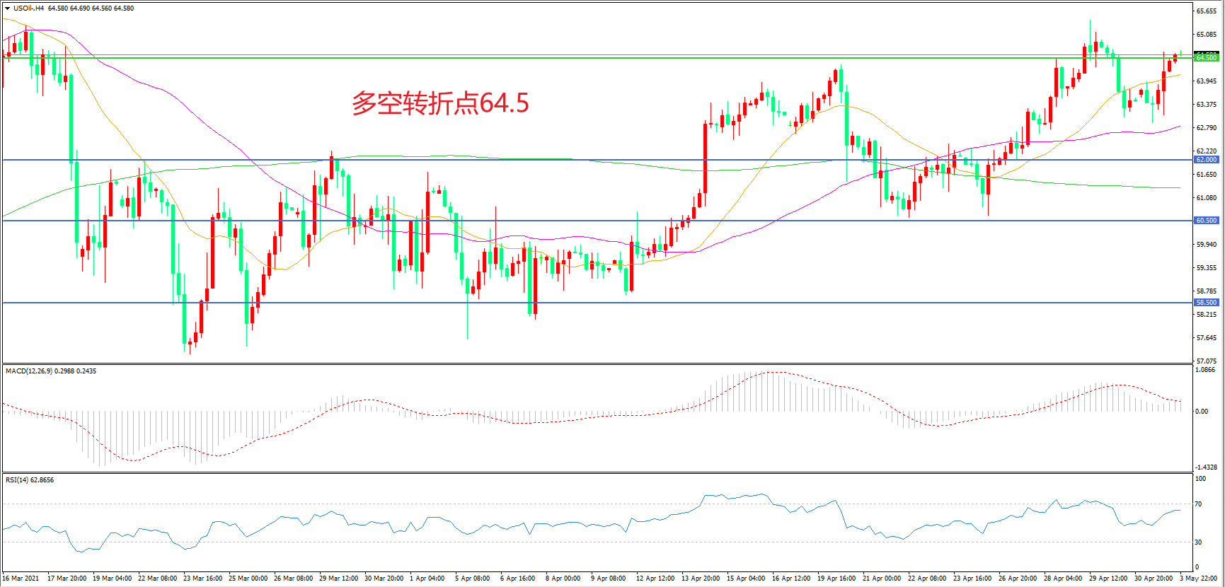 周一(5月3日),因中国的经济数据表现强劲和美国的疫苗接种率预示着这两大经济体的原油需求将会强劲反弹,市场风险情绪大幅回升,美国WTI原油大幅上涨,收报64.58美元/桶。目前油市后市的逻辑依旧是需求,因为供应起码在今年内,都是可控的,中东地缘政治冲突、大国博弈、美国对伊朗制裁放开的节奏都会对未来油价的走势产生影响。