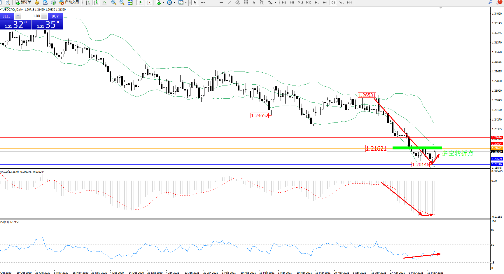交易策略:1.21621下方看跌,目标1.20629、1.20146