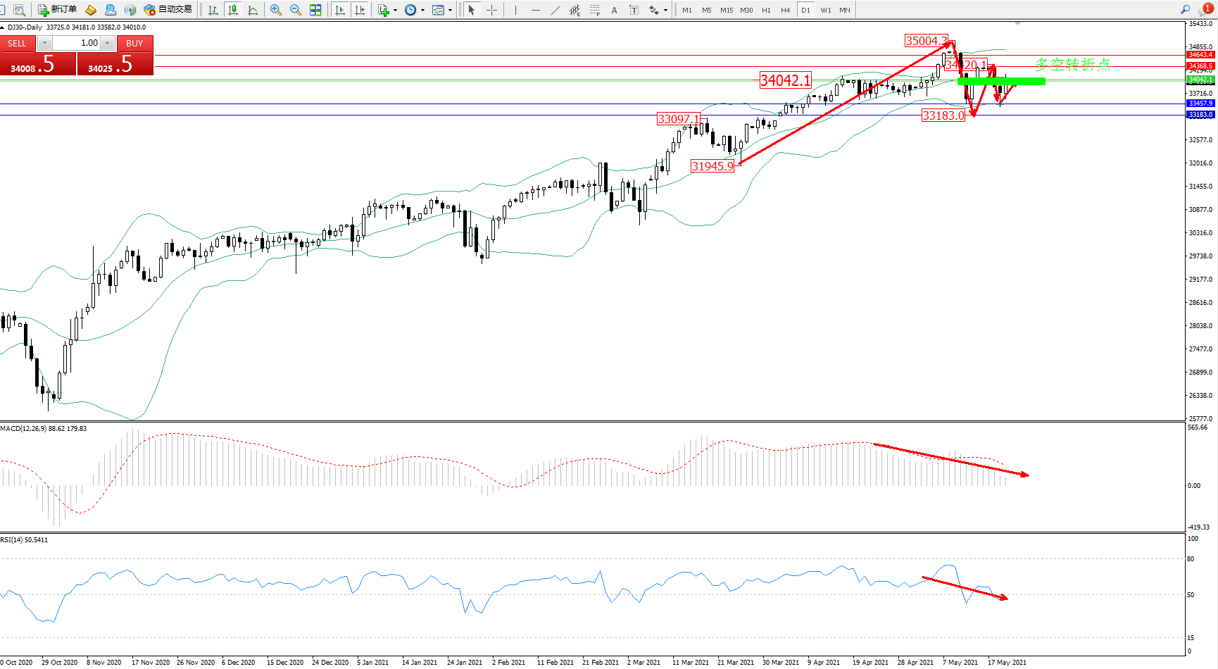 技术点评:多头动力延续布林带指标通道中上轨区间持续震荡上扬,高位抵达35004位置后遇阻回撤,多次纠结于中下轨区间维持震荡弱势整理中,布林带指标呈收口平移走势良好,关注中轨附近节点,MACD指标处于多头区域高位维持震荡向下移动,RSI指标处于50均衡线附近不断震荡下移中;