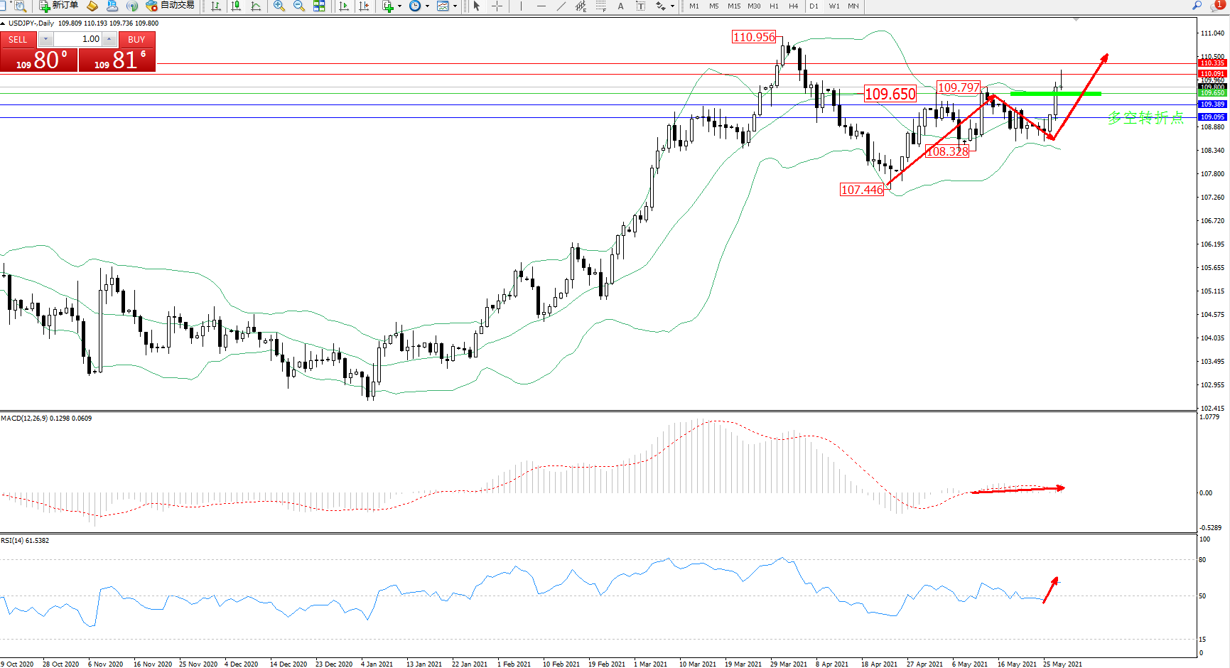 美元兑日元基本持稳于109.85,一度触及110.20,为4月6日以来最高水平。在美欧核心通胀率均大幅抬头的背景下,日本央行目前通胀仍为负值,这意味着后市日债收益率与欧债及美债的落差将进一步拉大,对日元汇价构成持续利空。除了上述利空外,日本严峻的疫情导致多府县延长紧急状态,这也令在距离开幕日仅剩八周之际,东京奥运会的举办前景充满阴影,对于日元汇价而言这是额外的利空。日本央行行长黑田东彦称,日本经济将在年底恢复到疫情前的水平。认为全球货币政策出现分化不存在问题。在新冠肺炎疫情之后,日本央行将继续宽松的政策。日本央行将在货币政策讨论中考虑气候因素。日本企业融资环境仍然严峻。