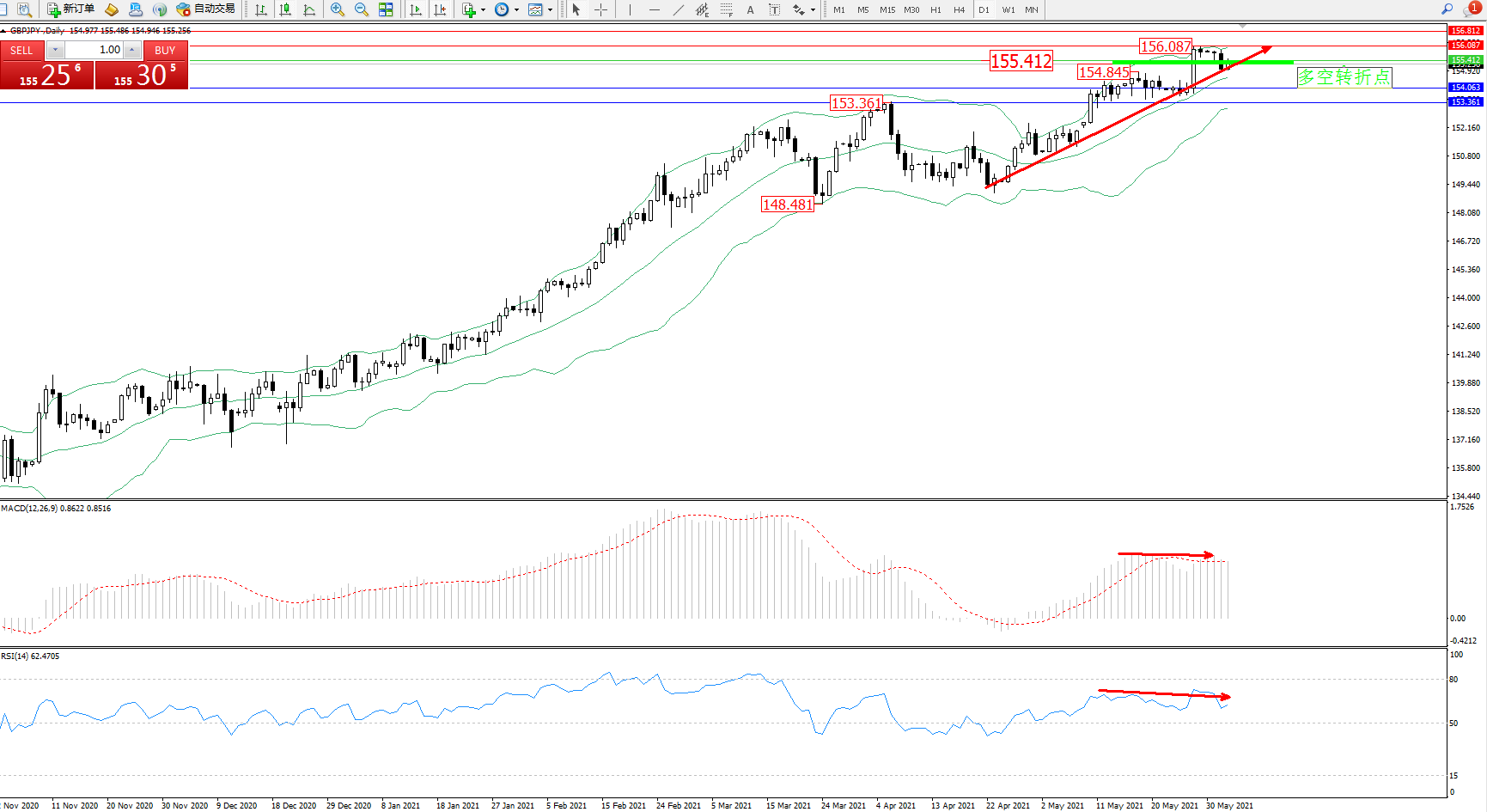 技术点评:多头动力延续布林带指标通道中上轨区间持续震荡上扬,高位抵达156.087位置后遇阻震荡回撤,即将触及中轨附近位置,短期或出现整理回调走势,布林带指标呈收口走势中,关注中上轨区间节点,MACD指标处于多头区域高位维持整理平移中,RSI指标处于多头区域维持震荡后有继续下移迹象;