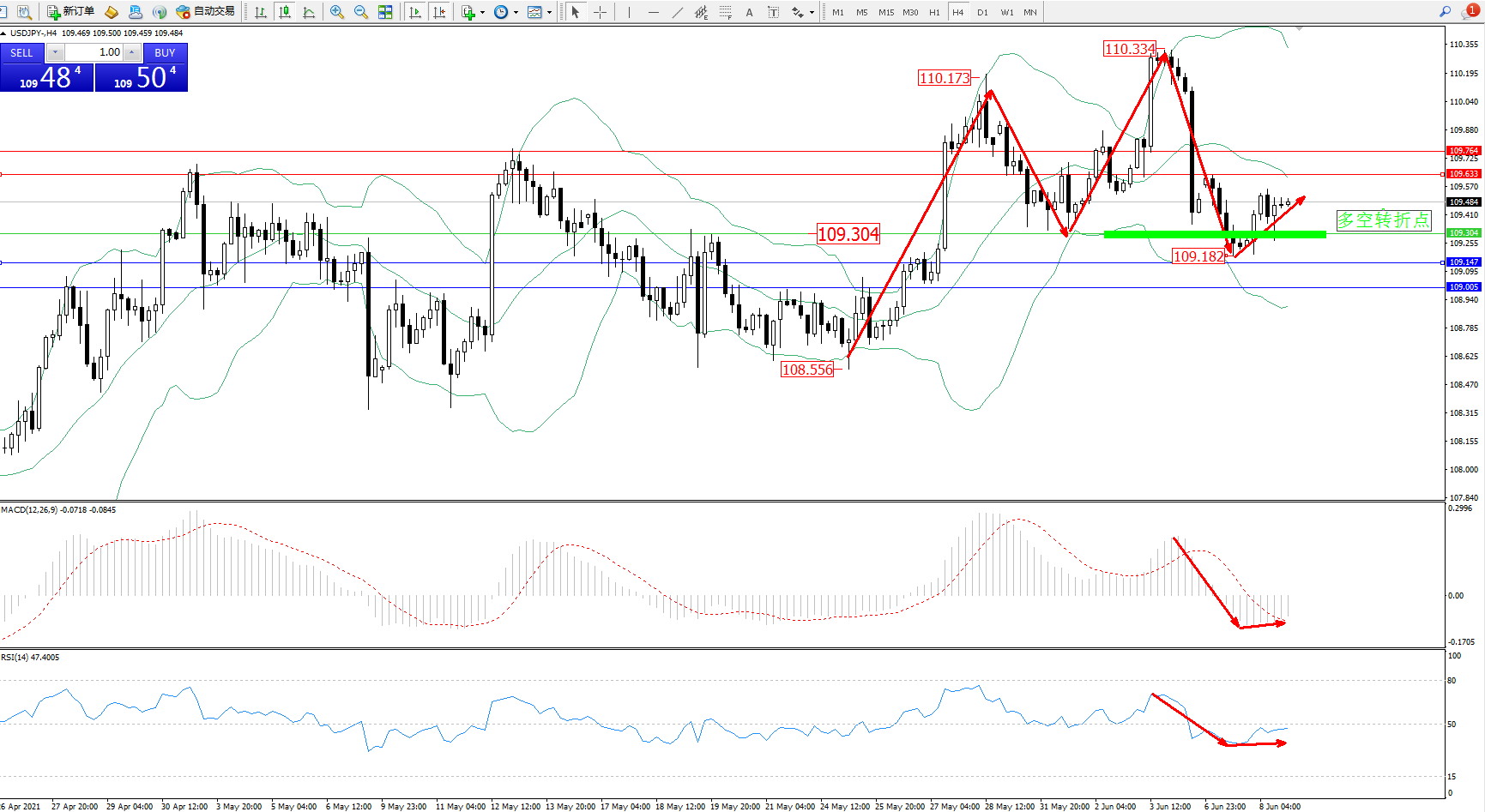 技术点评:长时间处于布林带指标通道维持宽幅震荡向上移动后,高位抵达110.334位置后遇阻回挫,跌至布林带指标中下轨区间节点109.182附近得到短暂支撑,反转整理回升,低位多头买盘有伺机入场反转向上移动态势,布林带指标呈张口走势持续中,MACD指标处于0轴线下方空头区域维持整理平移中,RSI指标处于50均衡线下方空头区域维持弱势徘徊中;