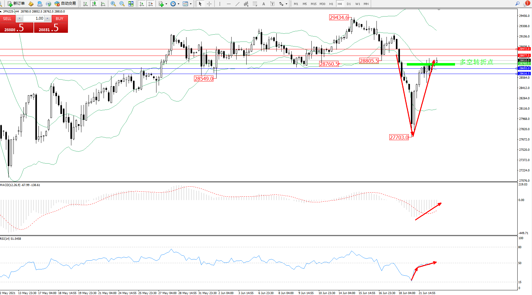 技术点评:空头动力急速下挫后,抵达27703位置强势回升中,呈V型反转态势不断上扬至布林带指标中轨附近后开始短暂震荡,多头动力有继续拉升态势,处于中上轨区间震荡上行,布林带指标呈收口走势持续中,MACD指标处于0轴线下方空头区域低位震荡不断上扬,RSI指标处于空头区域低位震荡上移至50均衡线附近弱势徘徊中;