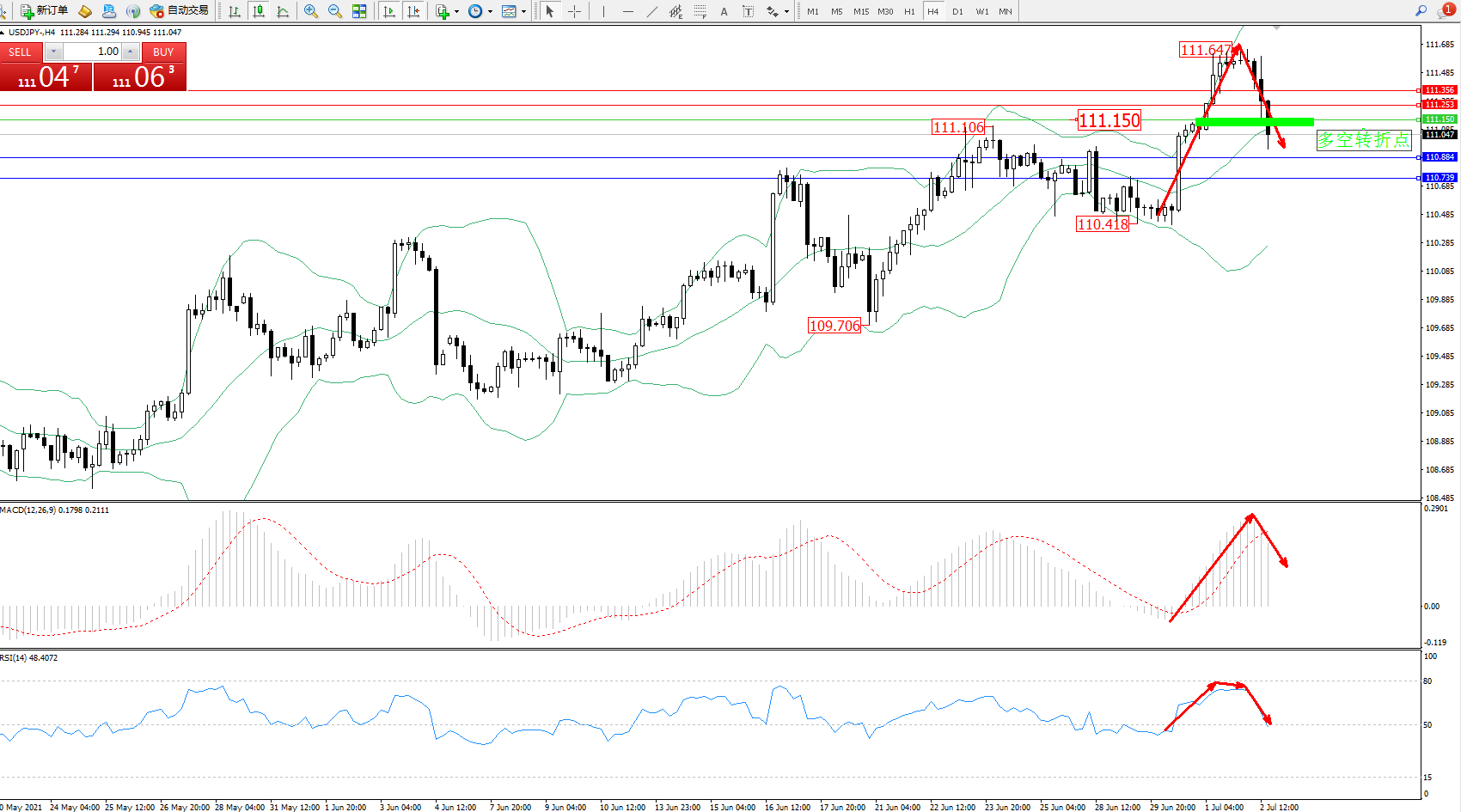 交易策略:111.150下方看跌,目标110.884、110.739