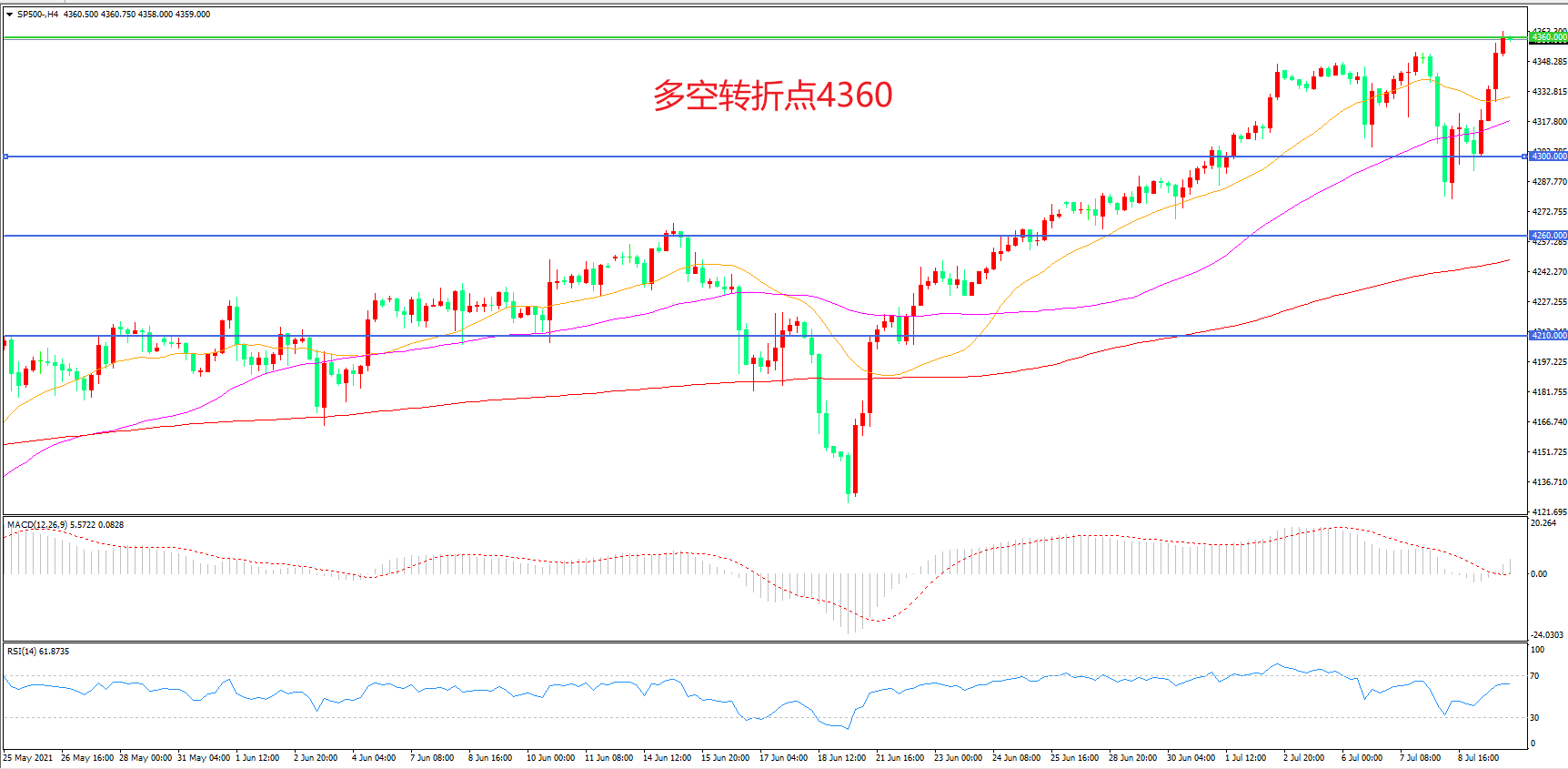 4小时图看,标普500回踩4300后强势拉升,短线表现强势,4360成为多空分水岭,均线系统呈多头排列,MACD红柱增加,RSI指标走平,日内震荡上行概率较大。