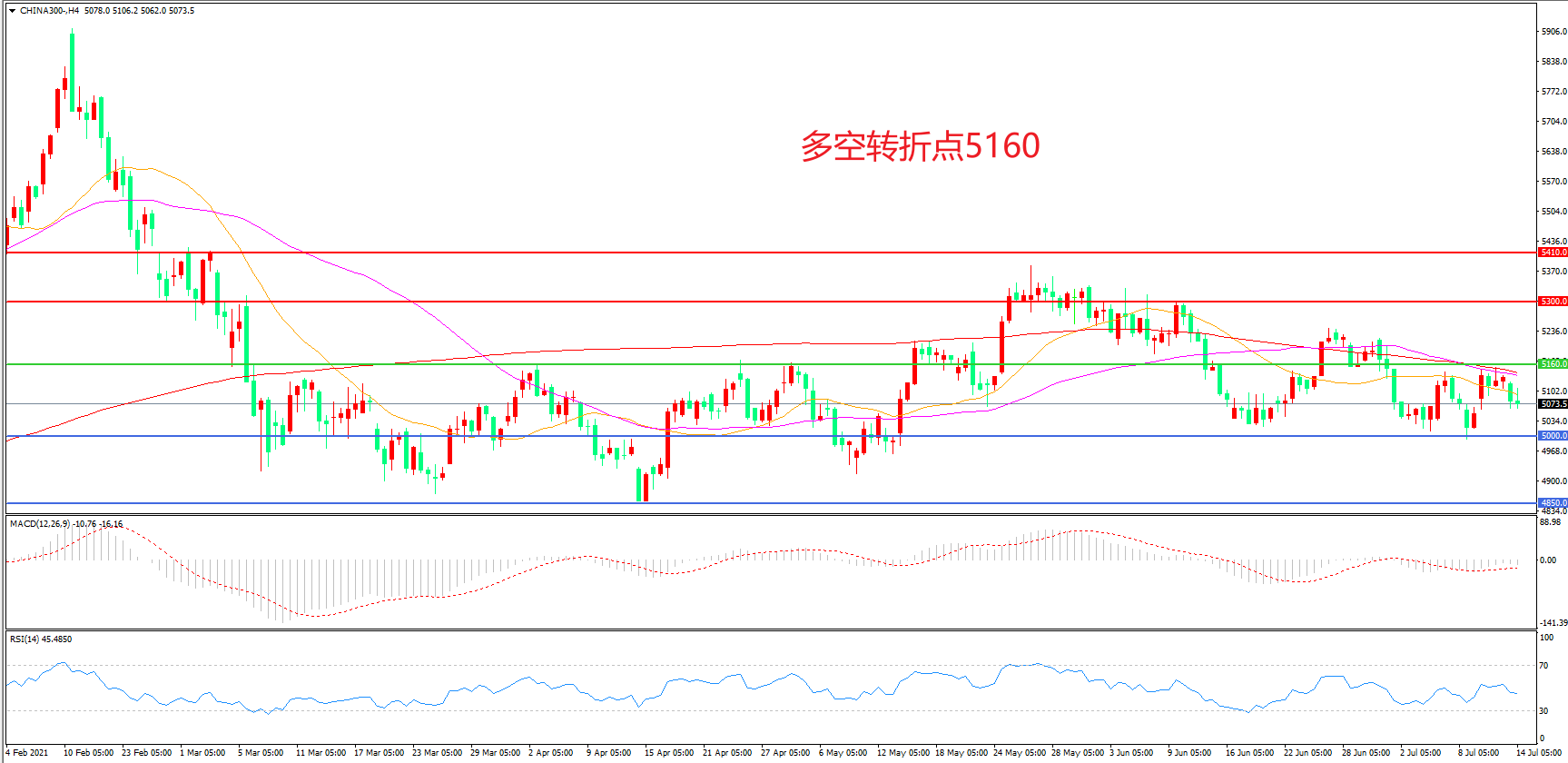4小时图看,沪深300受制于均线阻力震荡下行,高点逐渐降低,三角形整理形态明显,5000点成为下方支撑,MACD绿柱缩短,RSI指标走平,日内延续震荡概率较大。