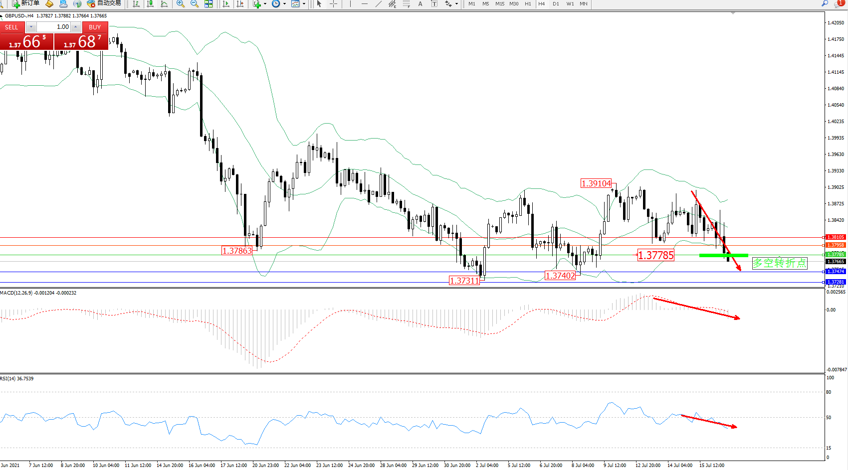 交易策略:1.37785下方看跌,目标1.37474、1.37281