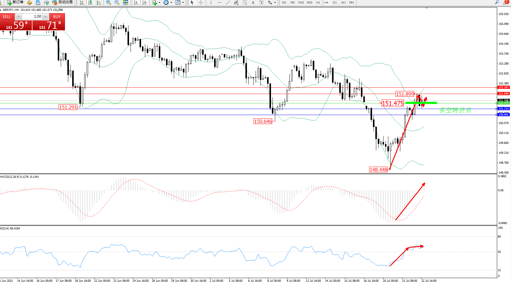 技术点评:低位多头动力强势拉升上扬,触及布林带指标上轨附近151.899位置后开始整理,短期拉升后或维持该位附近震荡中,布林带指标呈收口走势后开始有张口迹象,MACD指标低位多头动力强势拉升,纠结于0轴线上方徘徊中,RSI指标处于50均衡线上方弱势整理中;