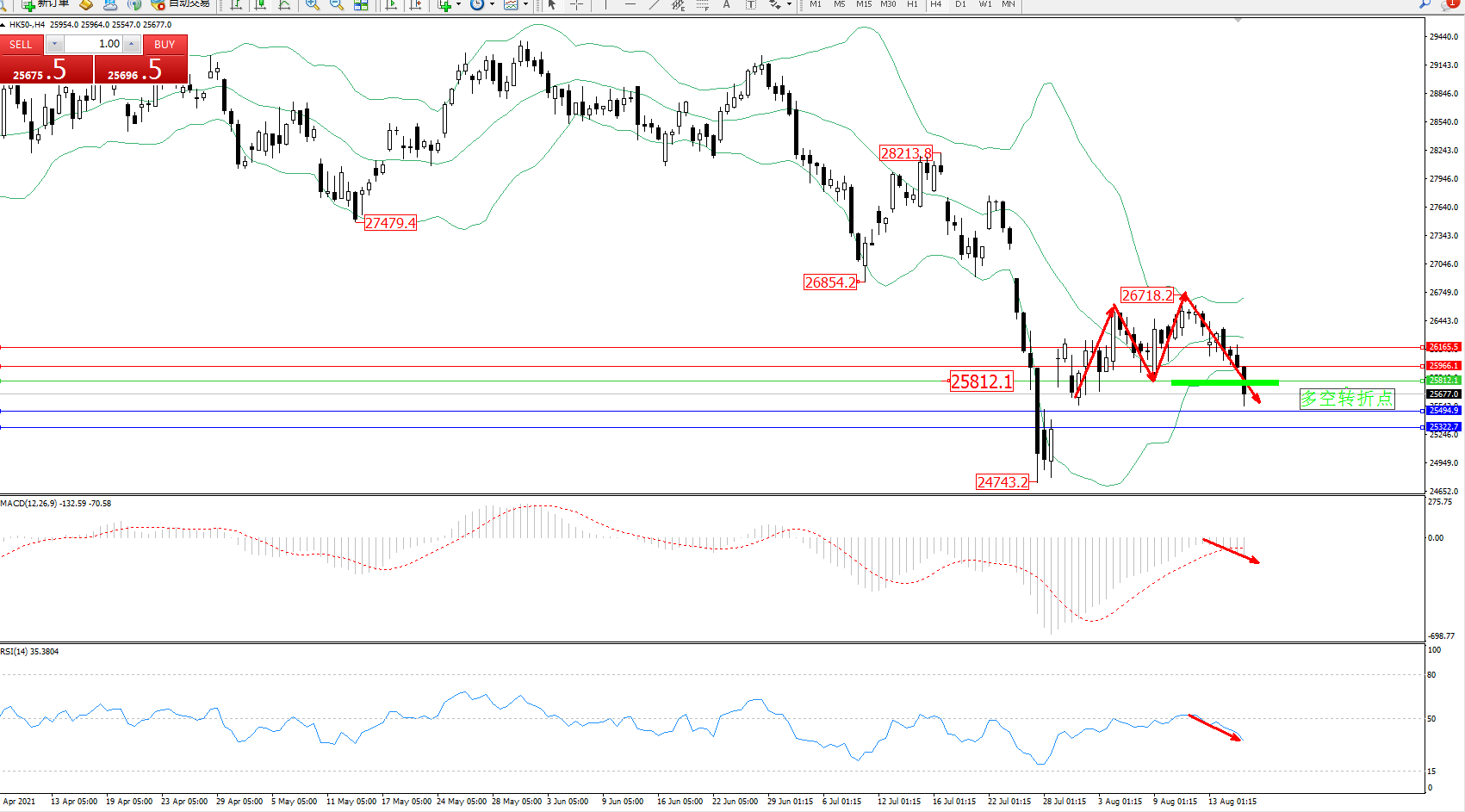 技术点评:M顶形态持续震荡下行,延续布林带指标下轨附近不断向下移动,跌势未见止步迹象,布林带指标呈收口走势后开始逐渐张口,MACD指标处于0轴线下方空头区域持续震荡向下移动中,RSI指标处于50均衡线下方空头区域震荡下行;