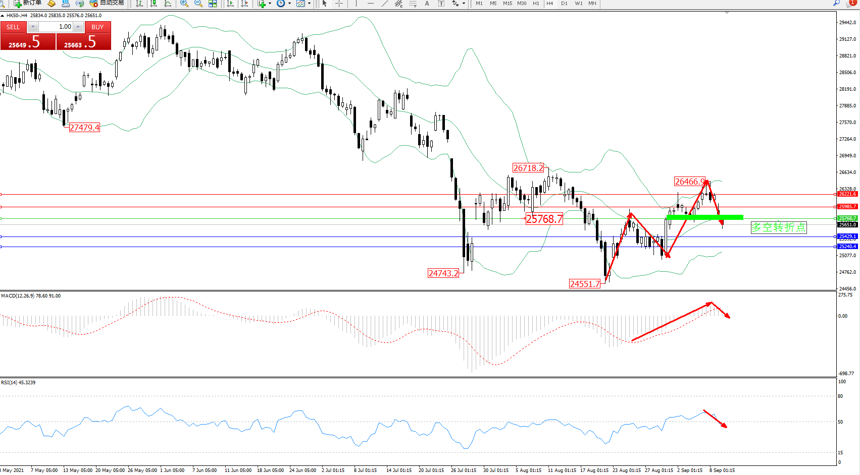 技术点评:低位多头动力呈阶梯式震荡上扬,高位延续布林带指标上轨附近持续震荡向上拉升,抵达26466位置节点后遇阻回撤,跌破中轨进入中下轨区间震荡,布林带指标呈上行趋势走势后开始有收口迹象,短期或出现继续回调走势,MACD指标多头动力持续震荡上移至多头区域后遇阻出现整理下行,RSI指标长时间维持在多头区域整理后开始回撤至50均衡线下方弱势徘徊;