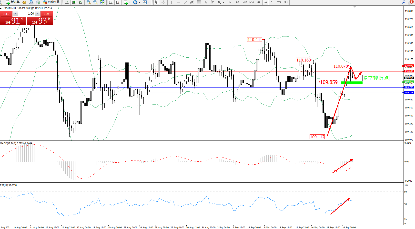 技术点评:低位多头动力强势拉升上移,高位触及布林带指标上轨附近节点110.078位置后遇阻短暂整理回撤,低位多头拉升动力持续,有进一步向上移动态势,布林带指标呈收口走势中,MACD指标低位多头动力持续震荡上移至0轴线上方弱势徘徊,RSI指标多头动力持续震荡上移至50均衡线上方弱势徘徊;