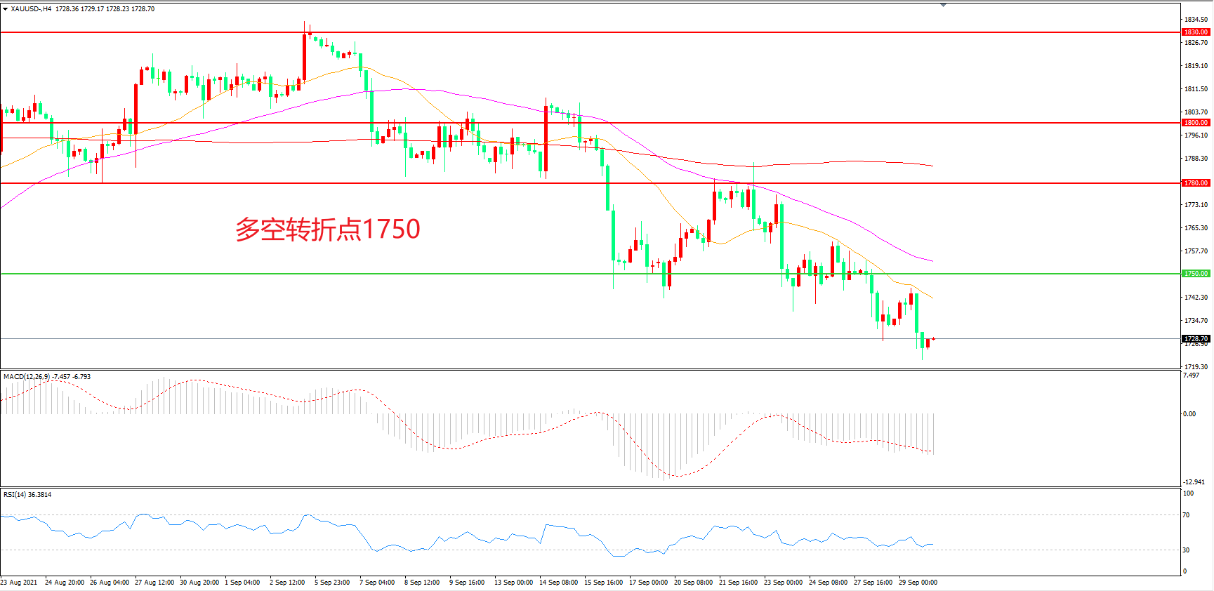 4小时图看,金价受制于均线系统压力破位下行,整体走势偏空,1750成为短期阻力,MACD绿柱增加,RSI指标走平,日内震荡下行概率较大。