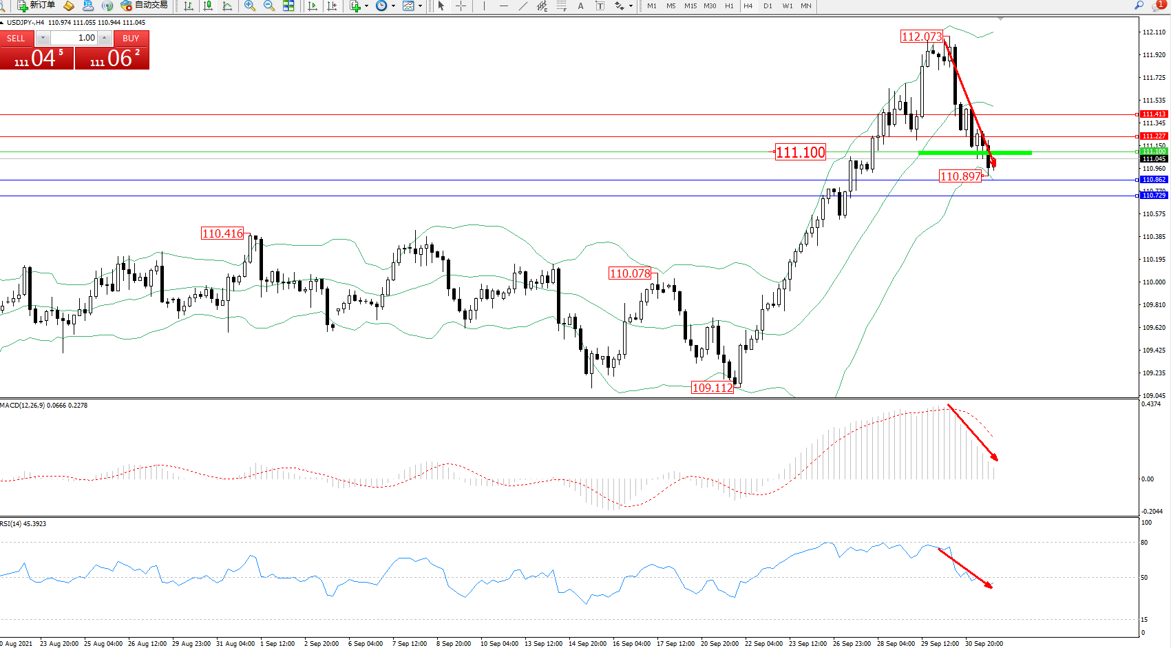 交易策略:111.100下方看跌,目标110.862、110.729