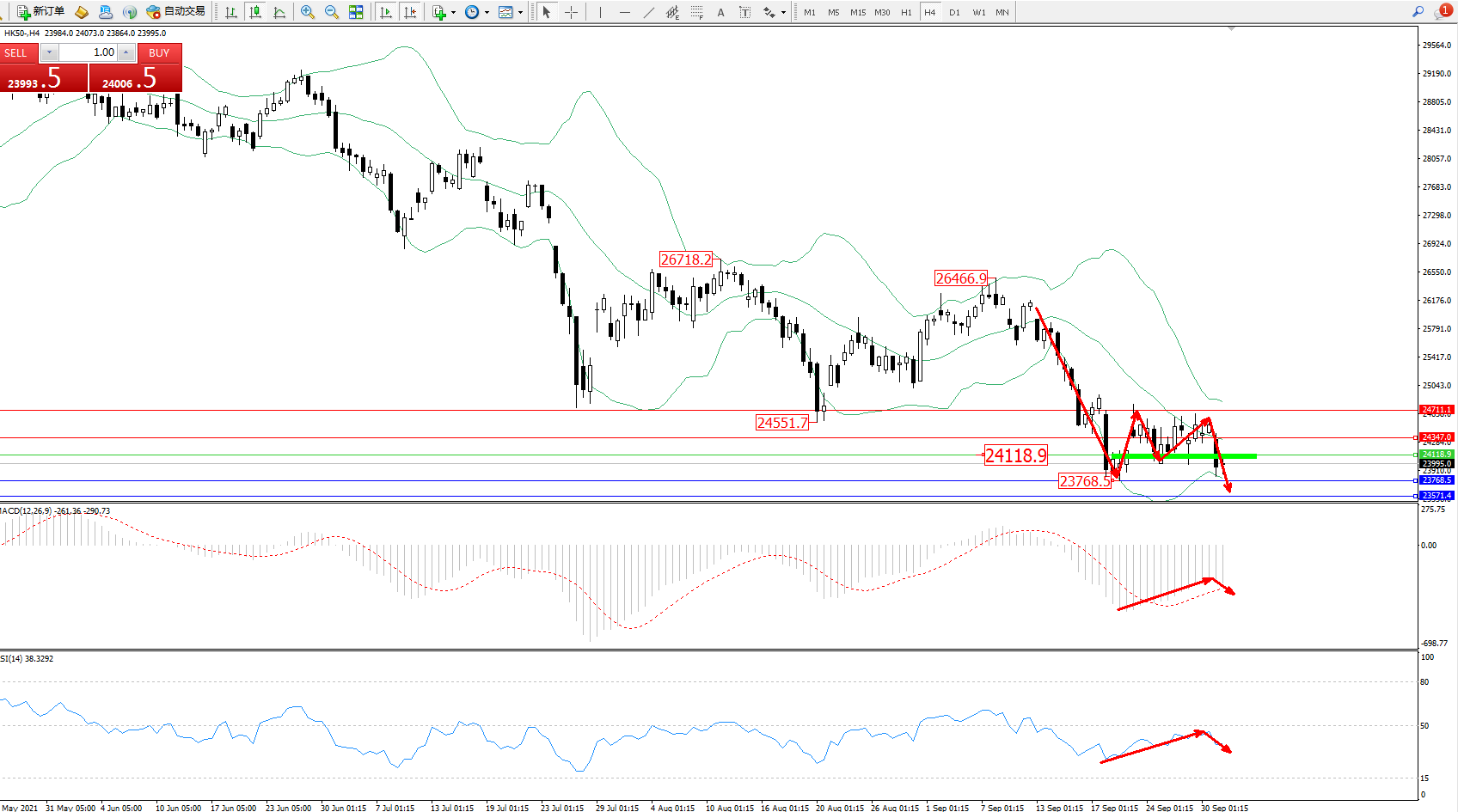 恒指HK50 ——4小时K线图显示: