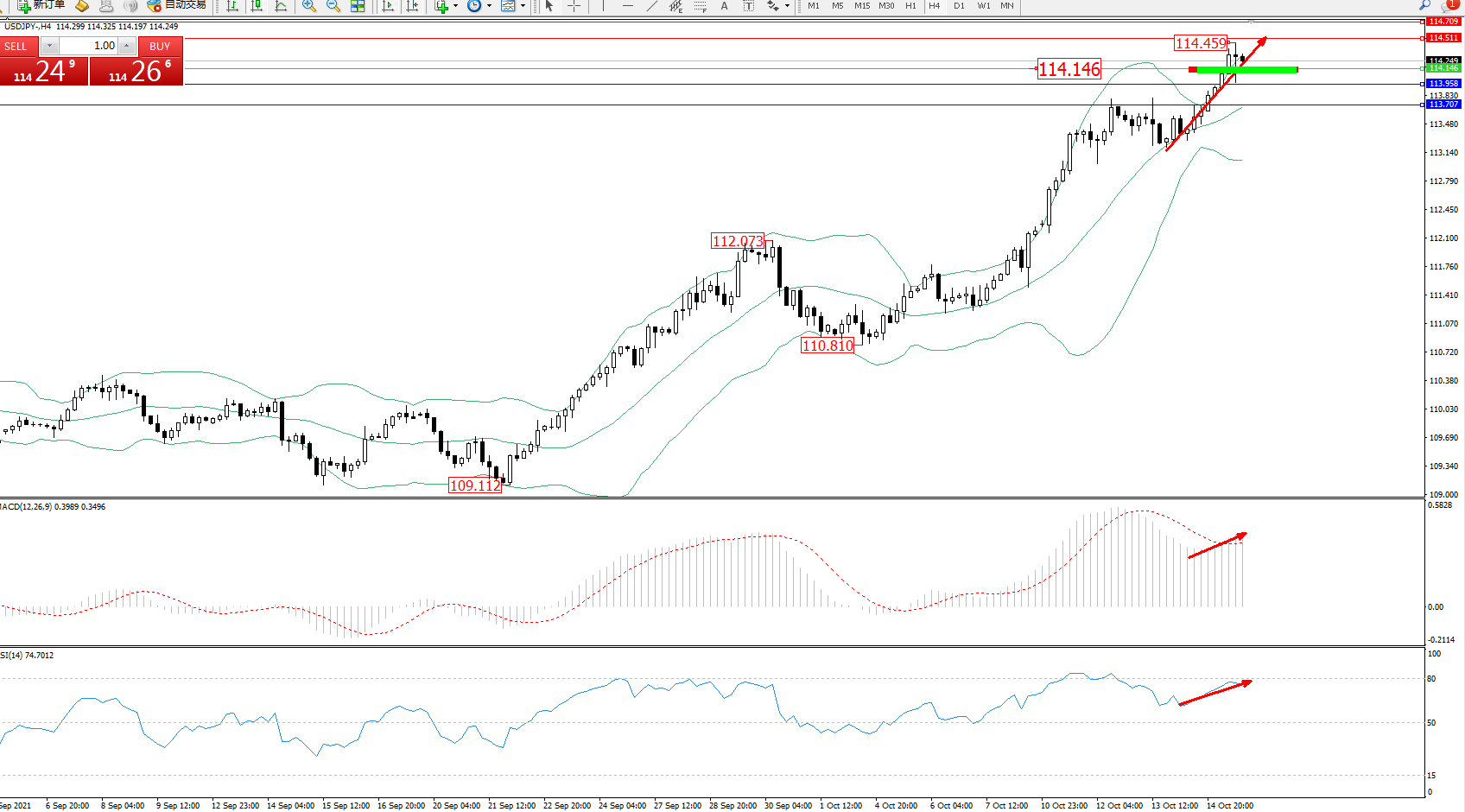 技术点评:多头动力延续布林带指标通道中上轨区间持续震荡上扬,高位抵达114.459位置后短暂遇阻震荡,多头动力有进一步向上移动态势,布林带指标呈上行趋势走势后缓慢张口走势中,MACD指标处于多头区域维持整理缓慢上移中,RSI指标处于堵头区域持续震荡上移,即将出超买区80均衡线附近节点;