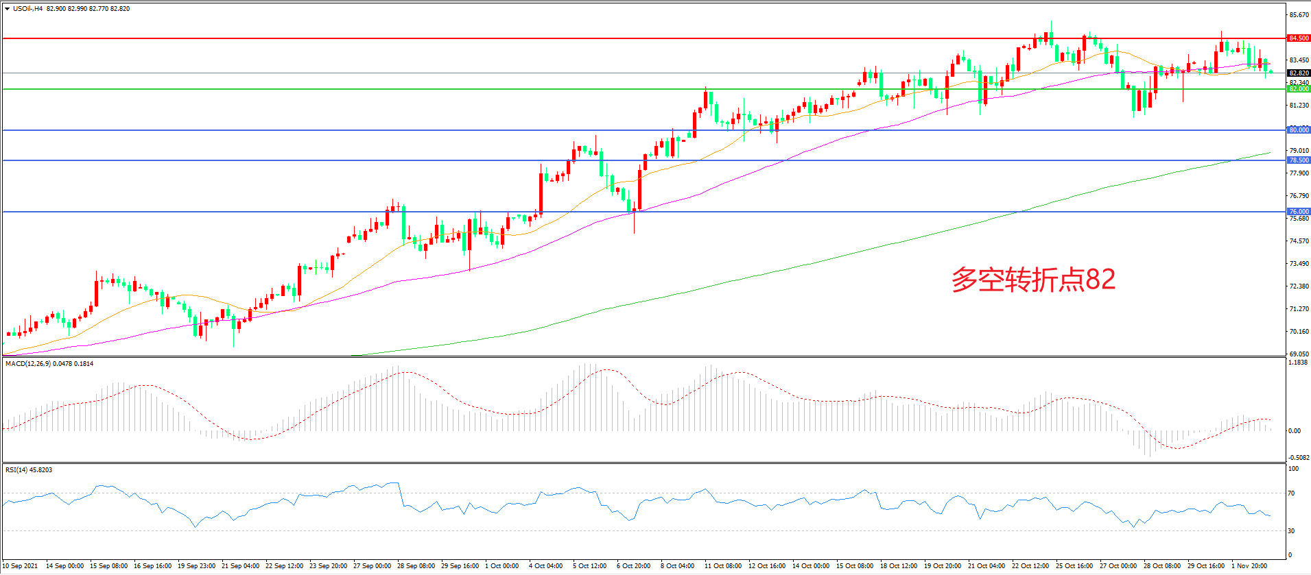 周三(11月3日)凌晨,API数据显示美国当周原油库存大增360万桶,在提高原油产量的压力越来越大的背景下,市场等待OPEC+的周四会议结果,美国WTI原油延续高位震荡,收报82.81美元/桶。从目前的信息来看,OPEC似乎仍将继续坚持每月增加40万桶产量的决议,并不会因为当前过高的油价或者快速去库存而大幅提高产量,市场投资者都在屏息等待最终结果。