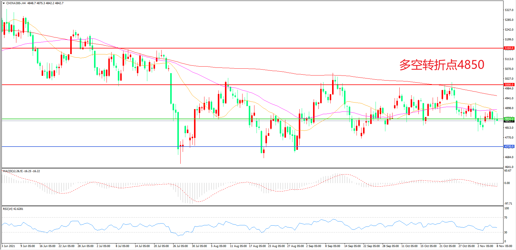 4小时图看,沪深300受制于均线压制,疲弱走势明显,200周期均线成为上方阻力,4850成为多空分水岭,MACD绿柱增加,RSI指标向下,日内震荡下行概率较大。