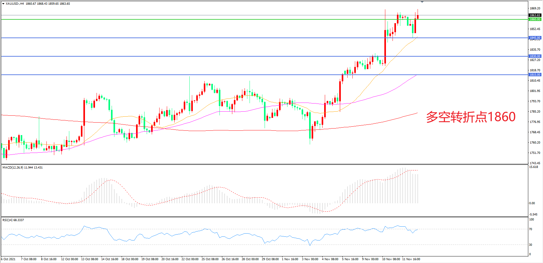 4小时图看,金价阳线连续拉升,短期走势偏强,1860一线被突破,1845成为明显支撑,MACD红柱缩短,RSI指标走平,日内震荡上行概率较大。