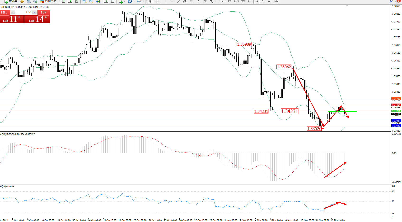 交易策略:1.34231下方看跌,目标1.33837、1.33630