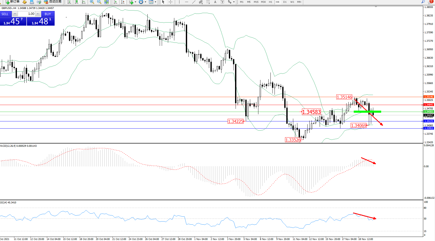 交易策略:1.34583下方看跌,目标1.34225、1.33953
