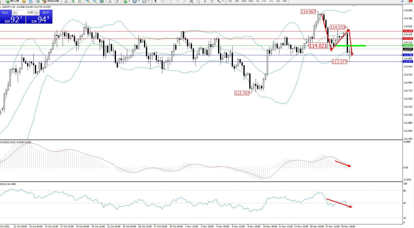技术点评:高位空头动力呈阶梯式震荡回撤,跌破布林带指标下轨至113.577位置节点后短暂支撑回升,但整体下行趋势走势持续,布林带指标呈收口走回持续平移中,短期有张口走势迹象,MACD指标空头动力维持整理缓慢下移至0轴线后开始进入空头区域徘徊,RSI指标处于50均衡线附近弱势整理后进入空头区域震荡;