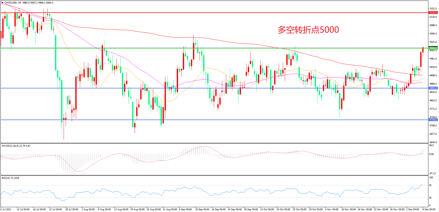 4小时图看,沪深300长阳连续拉升,短期表现偏强,均线系统形成下方支撑,MACD红柱增加,RSI指标走平,日内震荡上行概率较大。