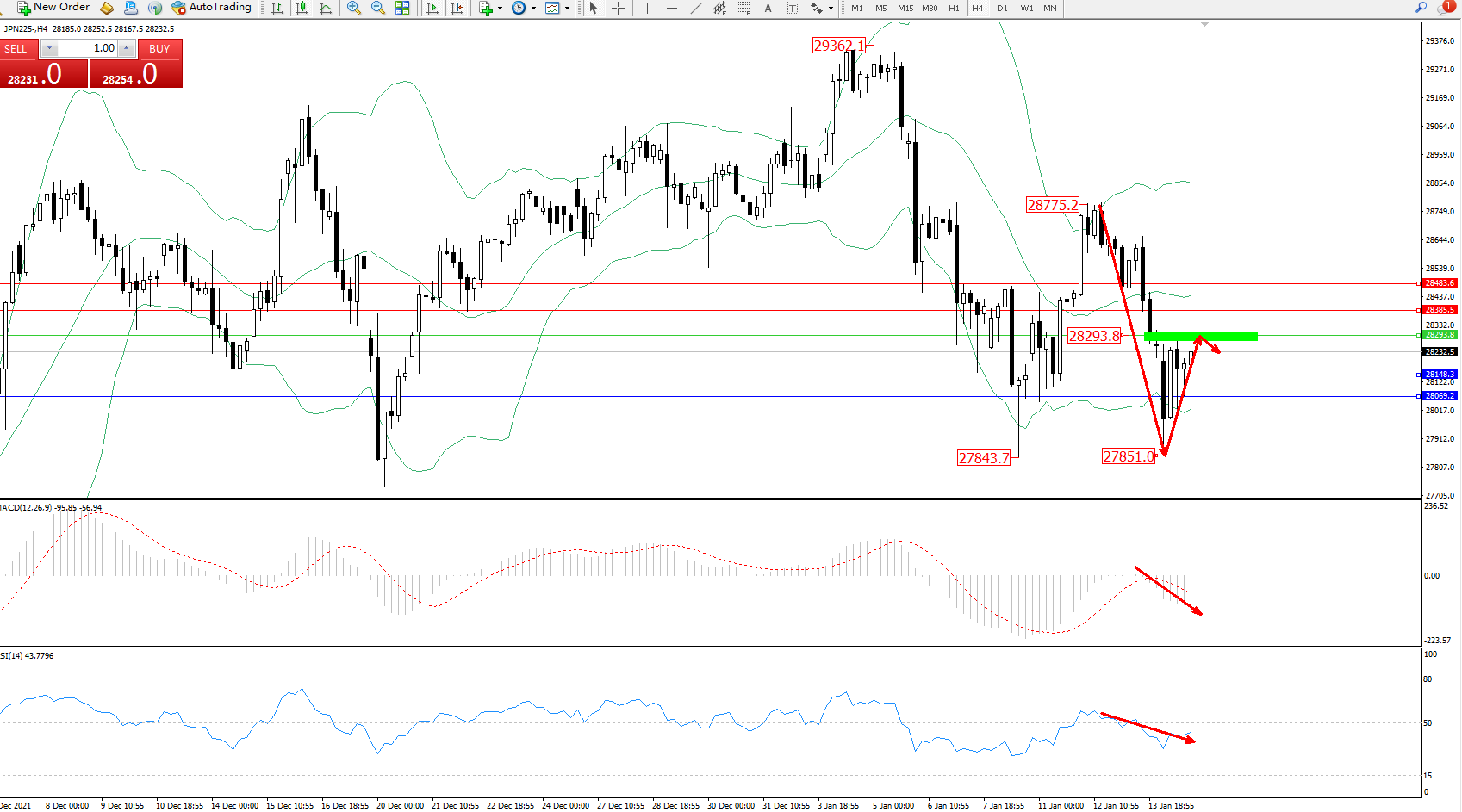 技术点评:高位空头动力急速下挫,跌破布林带指标下轨至27851位置后得到支撑反转上扬,纠结于布林带指标中下轨区间震荡,短期多头动力有伺机入场迹象,但依旧处于中下轨区间震荡中,布林带指标呈缓慢张口平移中,MACD指标处于0轴线下方空头区域维持震荡中,RSI指标处于50均衡线下方持续震荡中;