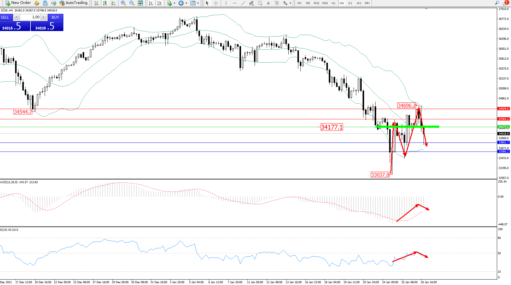 道琼斯指数1月26日(周三)收盘下跌130.63点,跌幅0.38%,报34167.10点;美联储年内首次议息会议释放“鹰派”信号,拖累美股尾盘大幅下挫。北京时间周四凌晨3点,美联储公布最新的1月利率决议,美联储维持利率0-0.25%不变,符合预期。美联储FOMC发表声明后,美联储基金期货仍暗示2022年将加息4次。将在加息后开始缩减资产负债表。美联储称,长期来看,美联储希望主要持有美国国债。缩表将通过再投资途径进行。