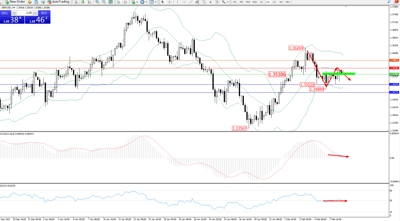 交易策略:1.35386下方看跌,目标1.35039、1.34771