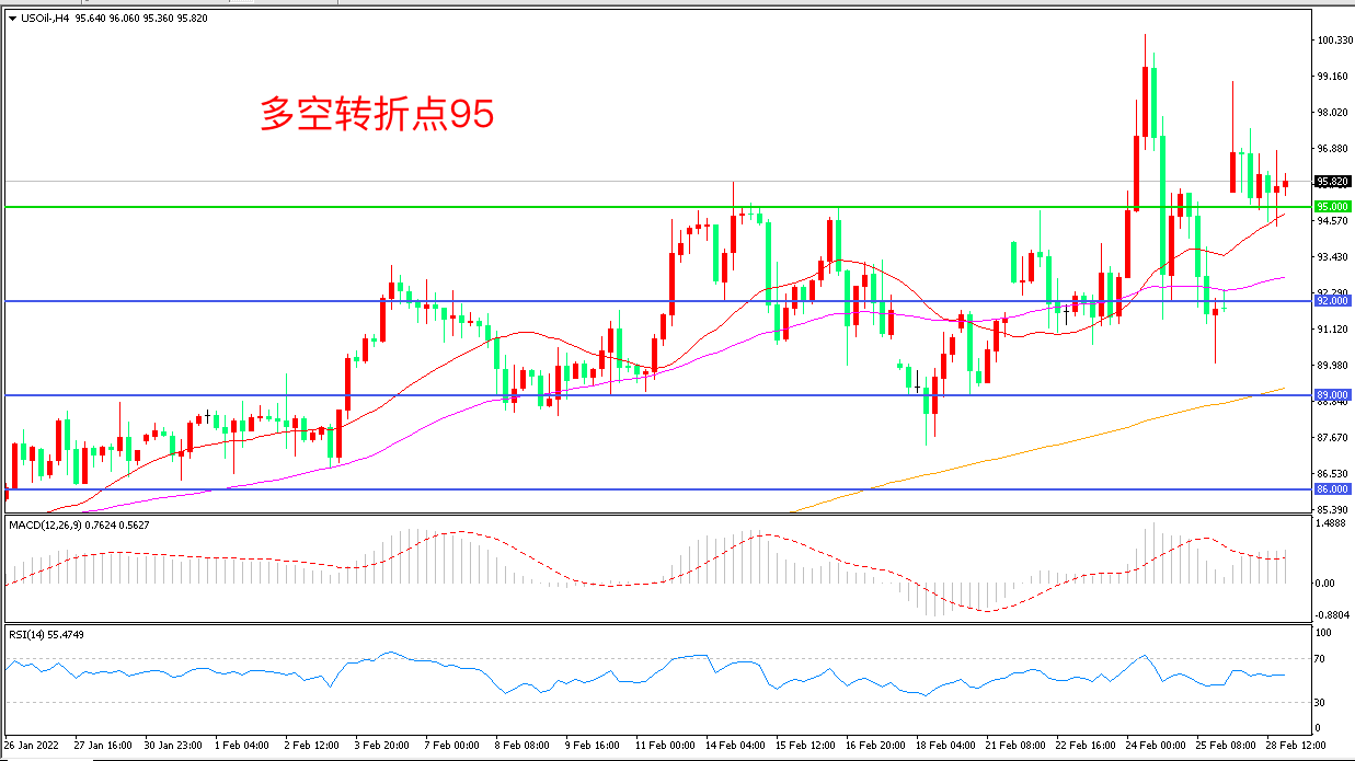 4小时图看,油价跳空高开后震荡回落,短期走势偏强,95美元成为多空分水岭,均线系统走平,MACD红柱缩短,RSI指标走平,日内震荡上行概率较大。