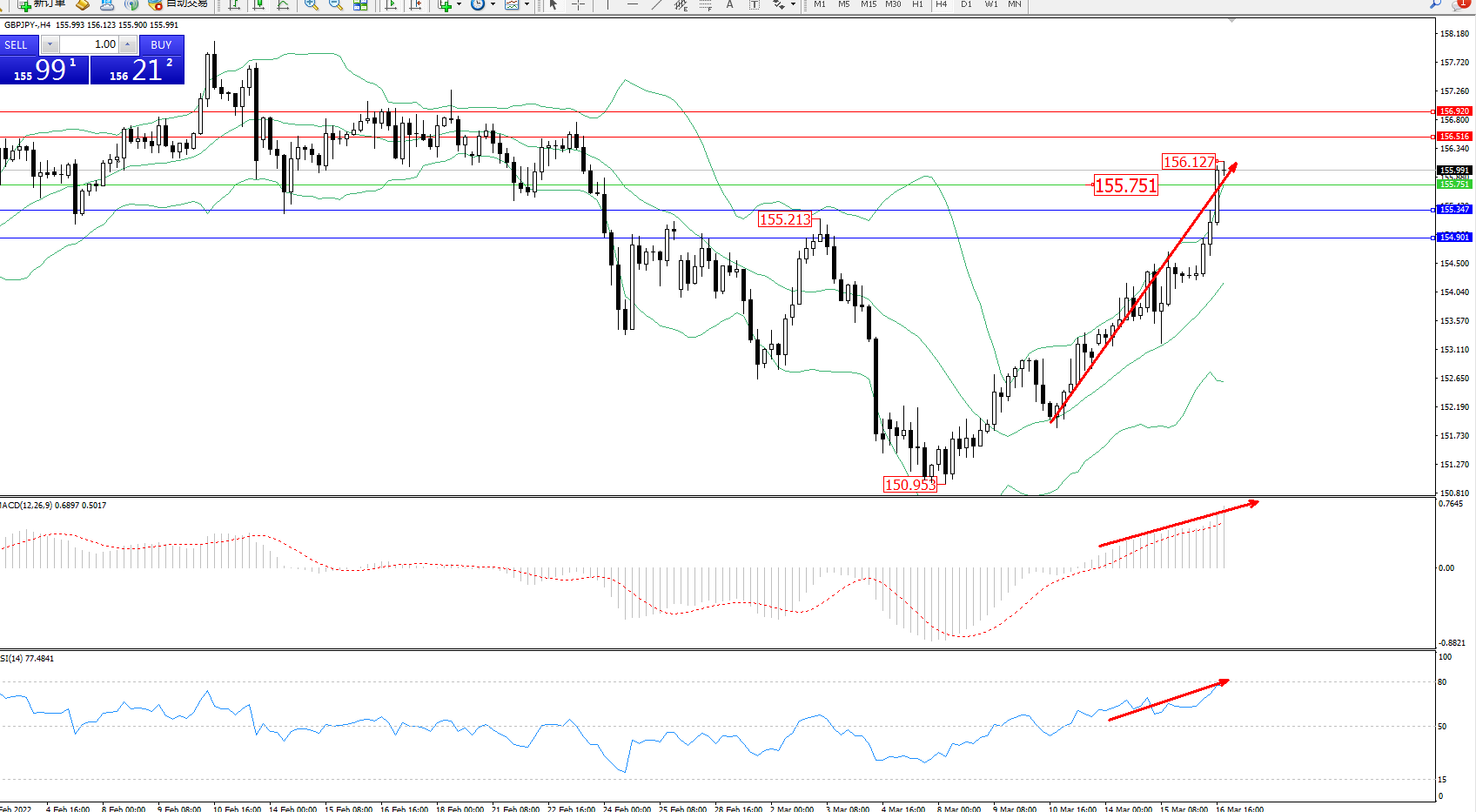 技术点评:多头动力延续布林带指标上轨附近持续震荡上扬,高位抵达156.127位置节点后开始整理,短期多头拉升走势或将持续,布林带指标呈上行趋势走势持续中,且处于缓慢张口走势中,MACD指标处于多头区域维持震荡不断上移,RSI指标处于多头区域维持整理上移至超买区80均衡线下侧徘徊;