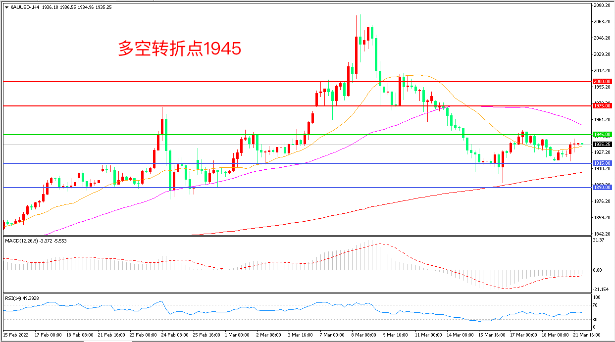 4小时图看,金价触碰1945一线后再度回落,短期走势陷入震荡,1945美元成为多空分水岭,MACD绿柱缩短,RSI指标走平,日内延续震荡概率较大。