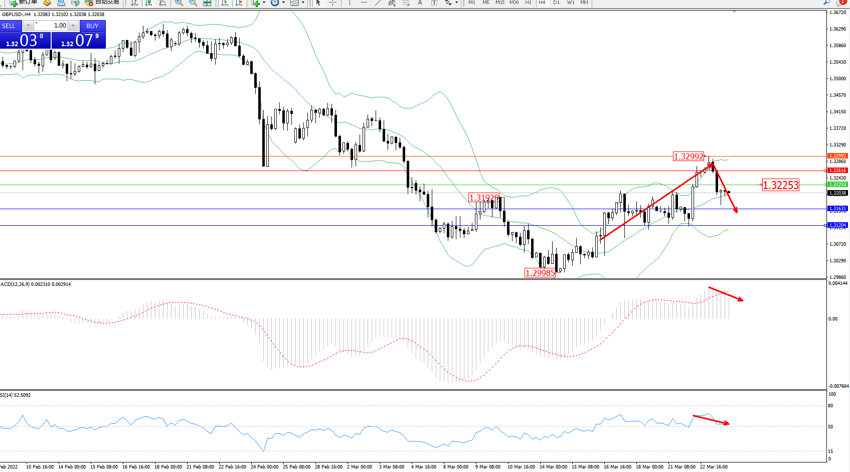 技术点评:多头动力延续布林带指标通道中上轨区间持续震荡上扬,高位抵达1.32992附近节点遇阻回撤,触及布林带指标中轨附近节点后开始整理,布林带指标呈张口走势后开始收口,MACD指标处于多头区域维持整理回撤,RSI指标处于多头区域回撤至50均衡线上側徘徊;