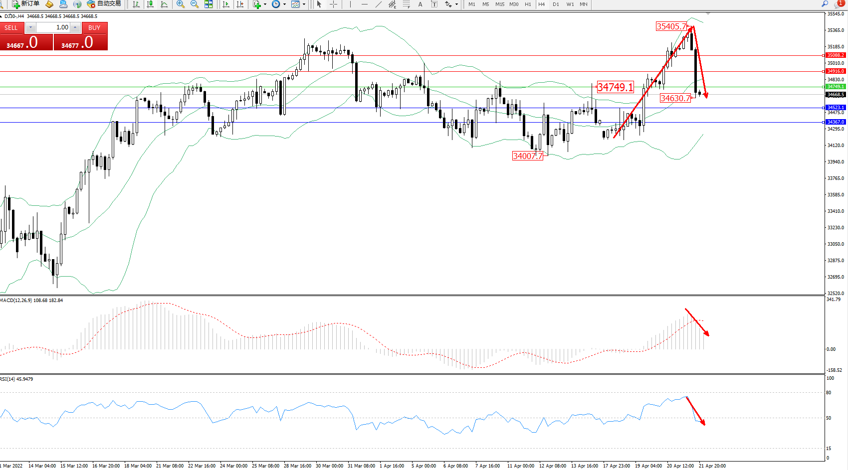 道琼斯指数DJ30——4小时K线图显示: