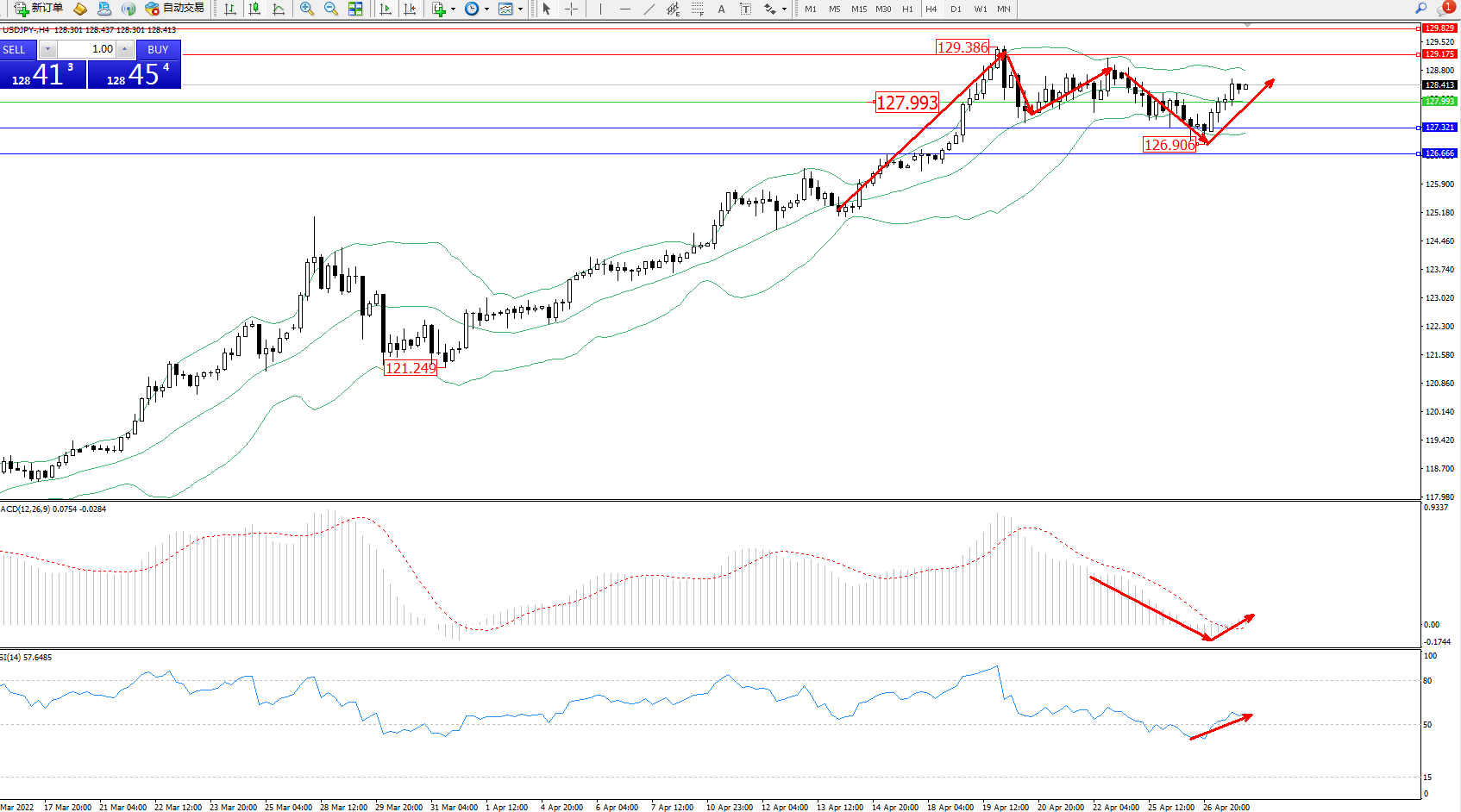 技术点评:多头动力延续布林带指标通道中上轨区间持续震荡上扬,高位抵达129.386附近节点后开始弱势整理回撤,短期触及126.906附近节点再度震荡向上移动,短期多头动力有进一步向上拉升态势,布林带指标传给你收口走势整理,MACD指标处于0轴线附近弱势徘徊,RSI指标处于50均衡线附近持续震荡向上移动中;