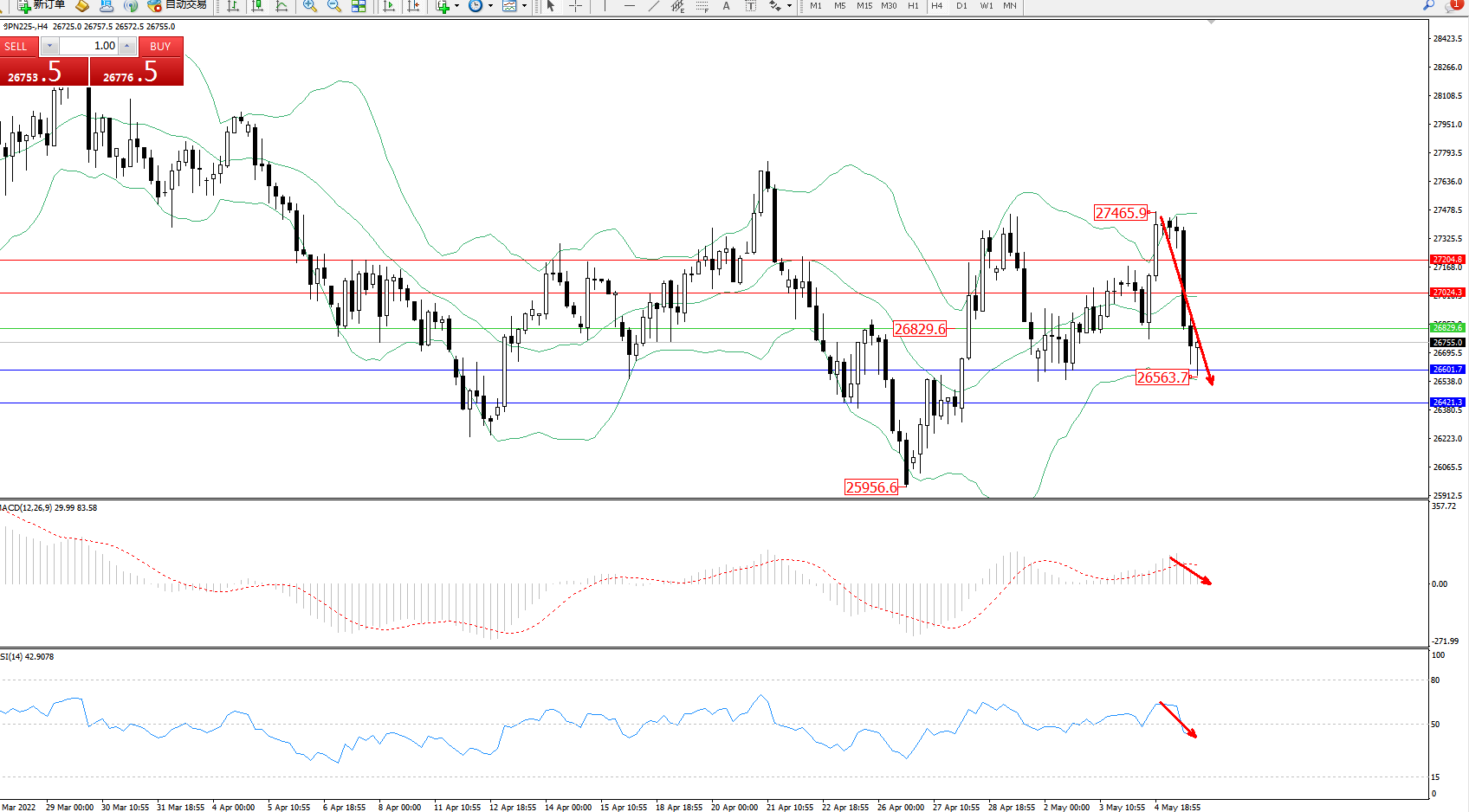 技术点评:多头动力维持宽幅震荡向上移动后,抵达27465附近节点短期震荡后,急速下挫,抵达布林带指标下轨26563附近节点后震荡,短期空头动力有继续下行态势,布林带指标呈宽幅震荡平移,MACD指标处于多头区域维持震荡下行至0轴线附近徘徊,RSI指标处于多头区域维持震荡下行至50均衡线下侧整理中;