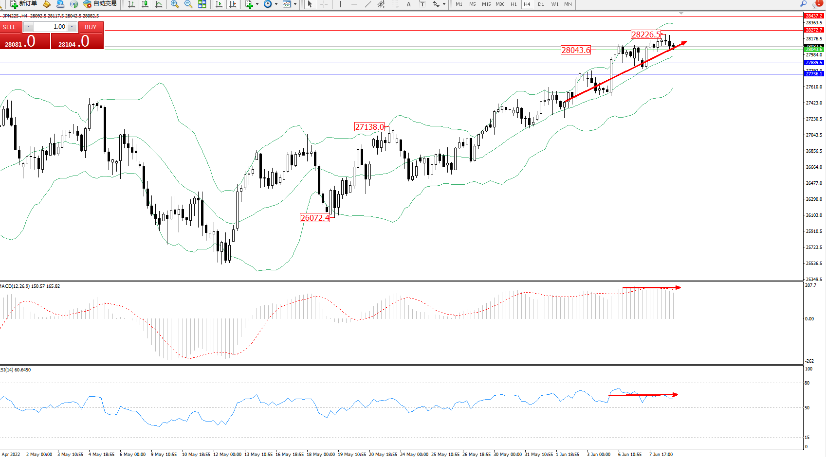 日经225指数6月8日(周三)收盘上涨289.05点,涨幅1.03%,报28233.00点。在实行了两年多的边境封闭政策后,日本将于本周欢迎国际游客回国;从6月10日开始,参加旅行团的外国游客可以进入日本;政府的首要任务仍然是增加国内游客数量 。