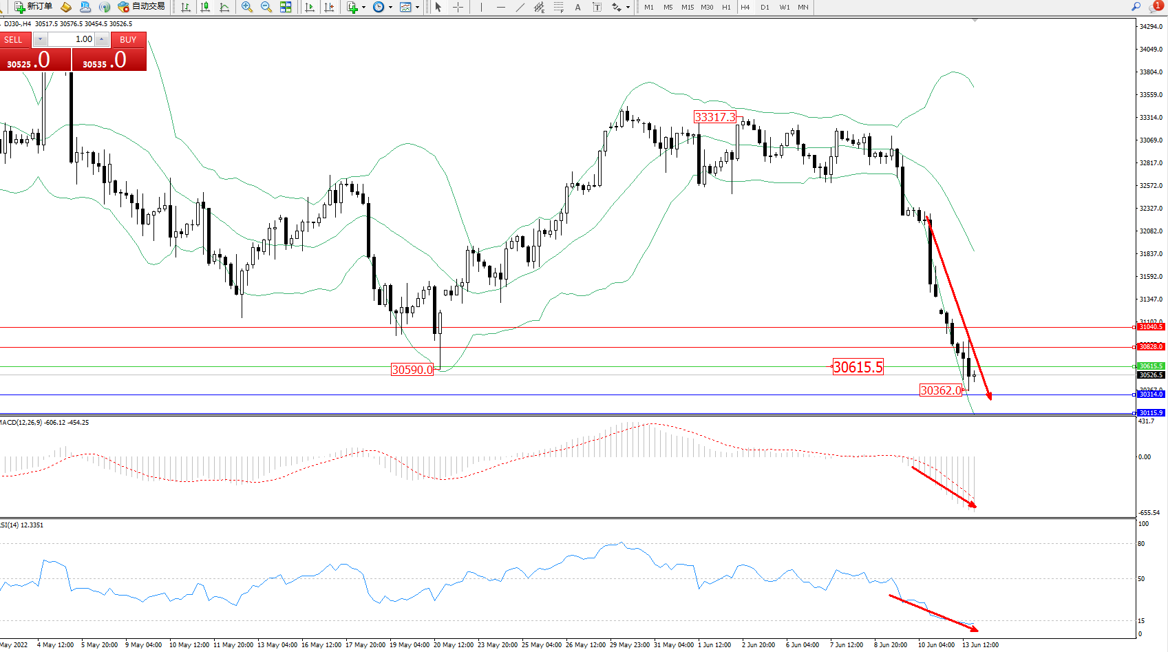 道琼斯指数6月13日(周一)收盘下跌975.39点,跌幅2.79%,报30517.40点;美国通胀数据可能会促使美联储周三加息75个基点。