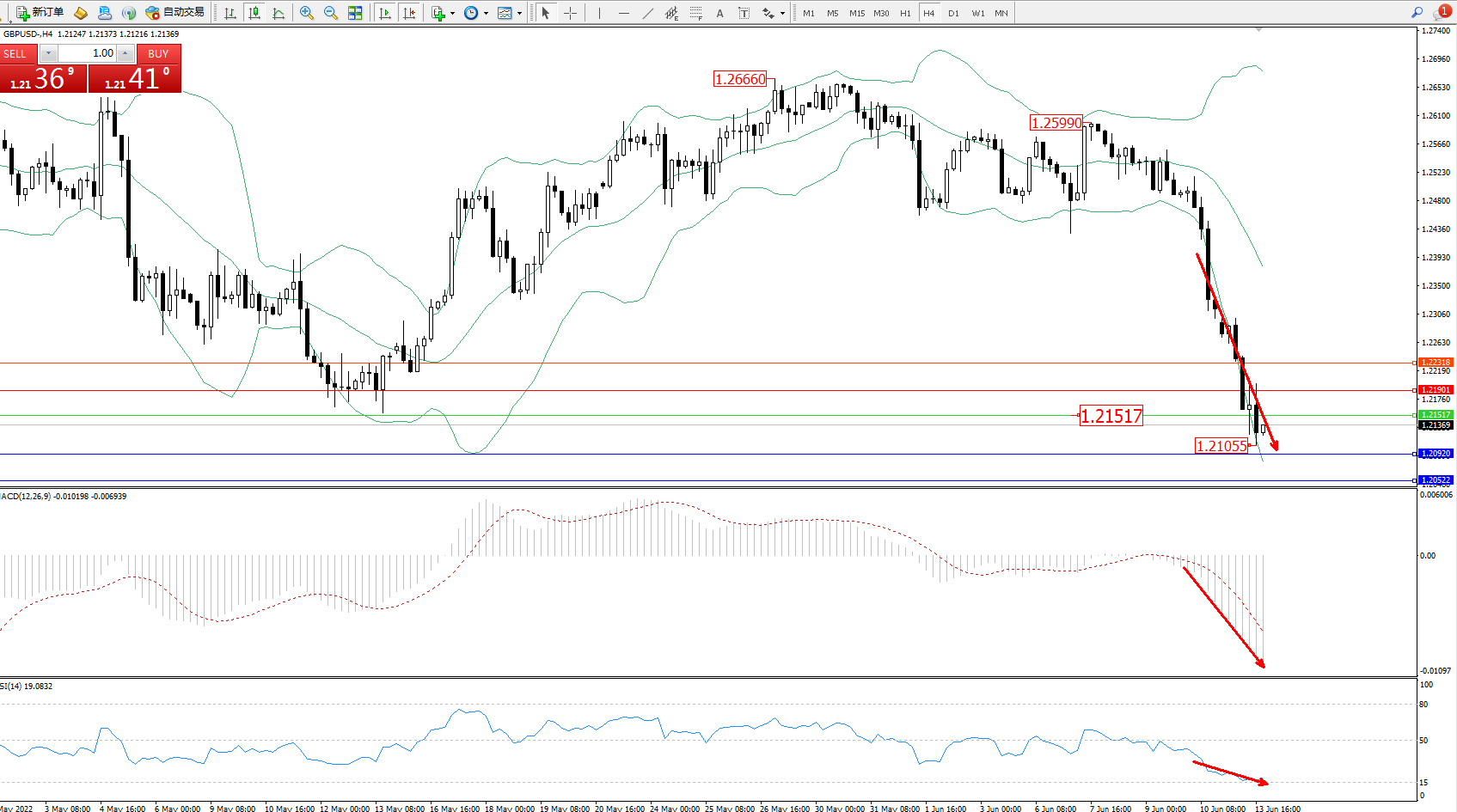 技术点评:空头动力延续布林带指标下轨附近不断下挫,低位抵达1.21055附近节点后整理,短期空头动力有继续下移态势,布林带指标呈张口走势后,高位开始有收口迹象,MACD指标处于空头区域急速下挫中,RSI指标处于超卖区15均衡线附近整理;